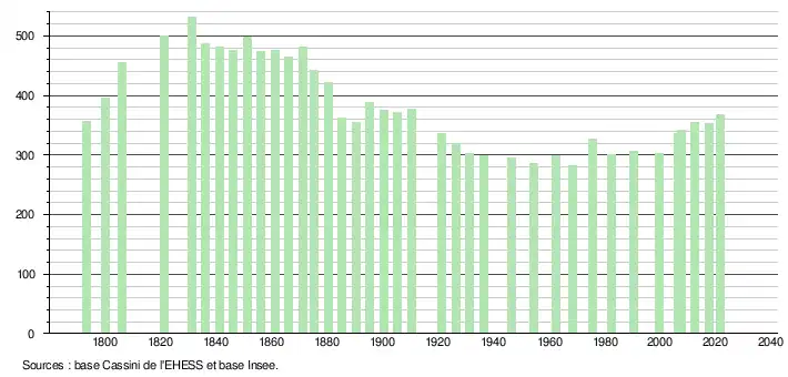 L'évolution du nombre d'habitants est connue à travers les recensements de la population effectués dans la commune depuis 1793. Pour les communes de moins de 10 000 habitants, une enquête de recensement portant sur toute la population est réalisée tous les cinq ans, les populations légales des années intermédiaires étant quant à elles estimées par interpolation ou extrapolation[21]. Pour la commune, le premier recensement exhaustif entrant dans le cadre du nouveau dispositif a été réalisé en 2007[22].