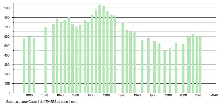 L'évolution du nombre d'habitants est connue à travers les recensements de la population effectués dans la commune depuis 1793. Pour les communes de moins de 10 000 habitants, une enquête de recensement portant sur toute la population est réalisée tous les cinq ans, les populations légales des années intermédiaires étant quant à elles estimées par interpolation ou extrapolation[18]. Pour la commune, le premier recensement exhaustif entrant dans le cadre du nouveau dispositif a été réalisé en 2007[19].