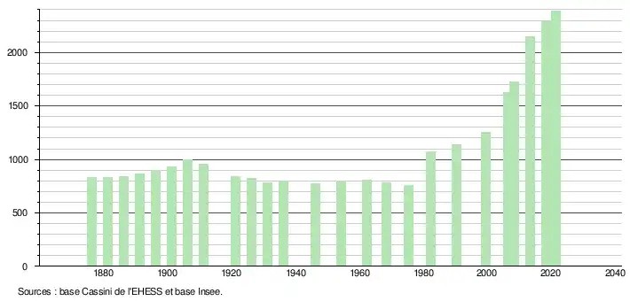 L'évolution du nombre d'habitants est connue à travers les recensements de la population effectués dans la commune depuis 1876. Pour les communes de moins de 10 000 habitants, une enquête de recensement portant sur toute la population est réalisée tous les cinq ans, les populations légales des années intermédiaires étant quant à elles estimées par interpolation ou extrapolation[28]. Pour la commune, le premier recensement exhaustif entrant dans le cadre du nouveau dispositif a été réalisé en 2008[29].
