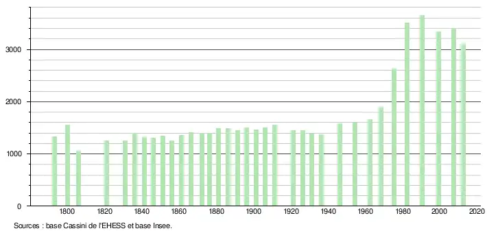 L'évolution du nombre d'habitants est connue à travers les recensements de la population effectués dans la commune depuis 1793. À partir du , les populations légales des communes sont publiées annuellement dans le cadre d'un recensement qui repose désormais sur une collecte d'information annuelle, concernant successivement tous les territoires communaux au cours d'une période de cinq ans. Pour les communes de moins de 10 000 habitants, une enquête de recensement portant sur toute la population est réalisée tous les cinq ans, les populations légales des années intermédiaires étant quant à elles estimées par interpolation ou extrapolation[19]. Pour la commune, le premier recensement exhaustif entrant dans le cadre du nouveau dispositif a été réalisé en 2007[20],[Note 2].