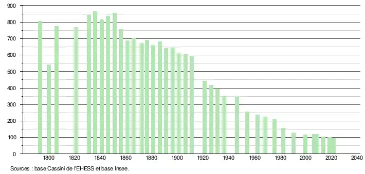L'évolution du nombre d'habitants est connue à travers les recensements de la population effectués dans la commune depuis 1793. Pour les communes de moins de 10 000 habitants, une enquête de recensement portant sur toute la population est réalisée tous les cinq ans, les populations légales des années intermédiaires étant quant à elles estimées par interpolation ou extrapolation[21]. Pour la commune, le premier recensement exhaustif entrant dans le cadre du nouveau dispositif a été réalisé en 2008[22].