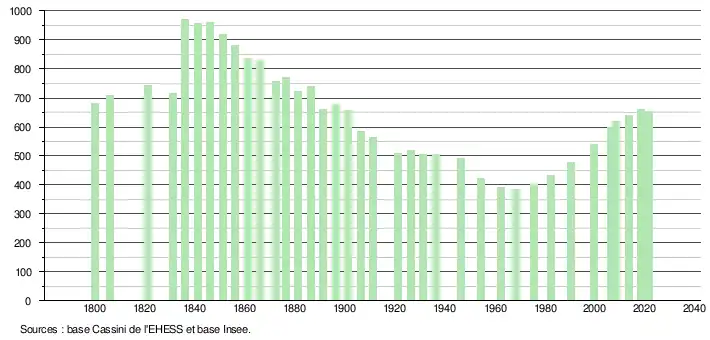L'évolution du nombre d'habitants est connue à travers les recensements de la population effectués dans la commune depuis 1800. Pour les communes de moins de 10 000 habitants, une enquête de recensement portant sur toute la population est réalisée tous les cinq ans, les populations légales des années intermédiaires étant quant à elles estimées par interpolation ou extrapolation[20]. Pour la commune, le premier recensement exhaustif entrant dans le cadre du nouveau dispositif a été réalisé en 2008[21].