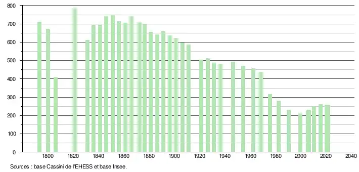 L'évolution du nombre d'habitants est connue à travers les recensements de la population effectués dans la commune depuis 1793. Pour les communes de moins de 10 000 habitants, une enquête de recensement portant sur toute la population est réalisée tous les cinq ans, les populations légales des années intermédiaires étant quant à elles estimées par interpolation ou extrapolation[17]. Pour la commune, le premier recensement exhaustif entrant dans le cadre du nouveau dispositif a été réalisé en 2005[18].