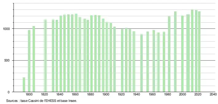 L'évolution du nombre d'habitants est connue à travers les recensements de la population effectués dans la commune depuis 1793. Pour les communes de moins de 10 000 habitants, une enquête de recensement portant sur toute la population est réalisée tous les cinq ans, les populations légales des années intermédiaires étant quant à elles estimées par interpolation ou extrapolation[28]. Pour la commune, le premier recensement exhaustif entrant dans le cadre du nouveau dispositif a été réalisé en 2007[29].