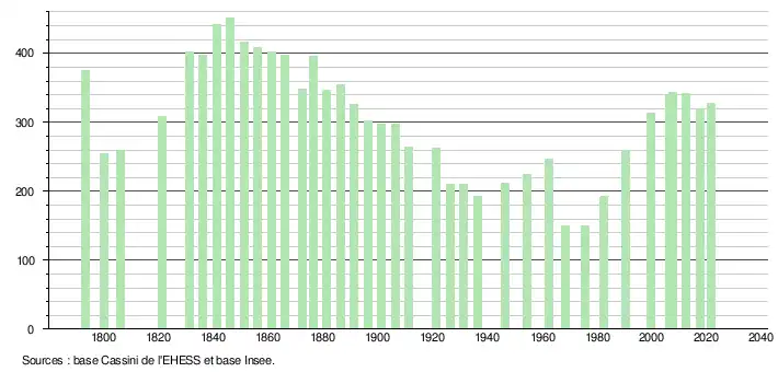 L'évolution du nombre d'habitants est connue à travers les recensements de la population effectués dans la commune depuis 1793. Pour les communes de moins de 10 000 habitants, une enquête de recensement portant sur toute la population est réalisée tous les cinq ans, les populations légales des années intermédiaires étant quant à elles estimées par interpolation ou extrapolation[19]. Pour la commune, le premier recensement exhaustif entrant dans le cadre du nouveau dispositif a été réalisé en 2007[20].