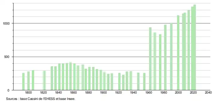 L'évolution du nombre d'habitants est connue à travers les recensements de la population effectués dans la commune depuis 1793. Pour les communes de moins de 10 000 habitants, une enquête de recensement portant sur toute la population est réalisée tous les cinq ans, les populations légales des années intermédiaires étant quant à elles estimées par interpolation ou extrapolation[21]. Pour la commune, le premier recensement exhaustif entrant dans le cadre du nouveau dispositif a été réalisé en 2008[22].