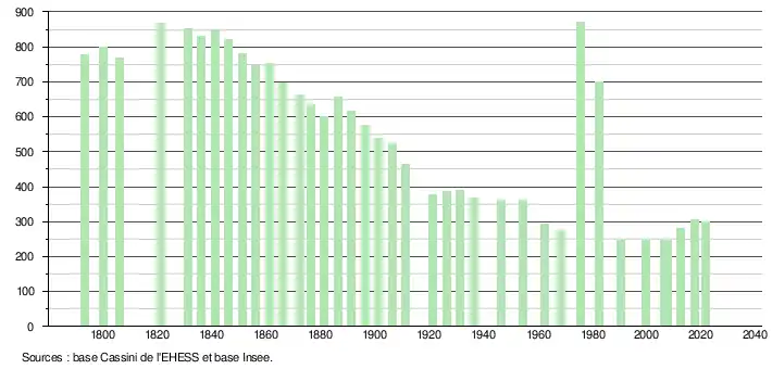 L'évolution du nombre d'habitants est connue à travers les recensements de la population effectués dans la commune depuis 1793. Pour les communes de moins de 10 000 habitants, une enquête de recensement portant sur toute la population est réalisée tous les cinq ans, les populations légales des années intermédiaires étant quant à elles estimées par interpolation ou extrapolation[20]. Pour la commune, le premier recensement exhaustif entrant dans le cadre du nouveau dispositif a été réalisé en 2007[21].