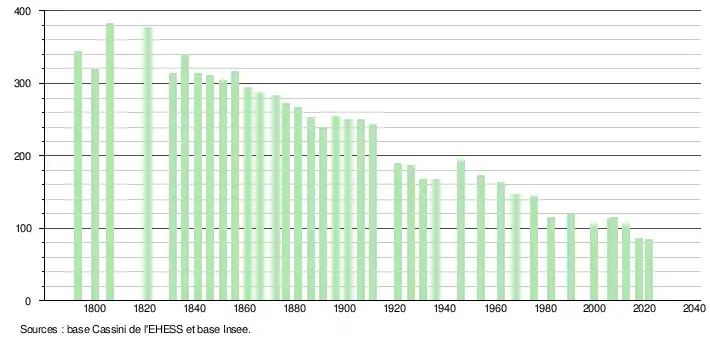 L'évolution du nombre d'habitants est connue à travers les recensements de la population effectués dans la commune depuis 1793. Pour les communes de moins de 10 000 habitants, une enquête de recensement portant sur toute la population est réalisée tous les cinq ans, les populations légales des années intermédiaires étant quant à elles estimées par interpolation ou extrapolation[20]. Pour la commune, le premier recensement exhaustif entrant dans le cadre du nouveau dispositif a été réalisé en 2007[21].