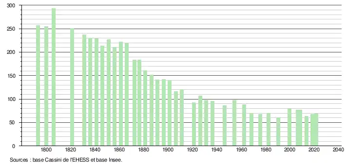 L'évolution du nombre d'habitants est connue à travers les recensements de la population effectués dans la commune depuis 1793. Pour les communes de moins de 10 000 habitants, une enquête de recensement portant sur toute la population est réalisée tous les cinq ans, les populations légales des années intermédiaires étant quant à elles estimées par interpolation ou extrapolation[17]. Pour la commune, le premier recensement exhaustif entrant dans le cadre du nouveau dispositif a été réalisé en 2008[18].