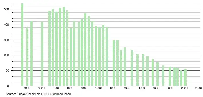 L'évolution du nombre d'habitants est connue à travers les recensements de la population effectués dans la commune depuis 1793. Pour les communes de moins de 10 000 habitants, une enquête de recensement portant sur toute la population est réalisée tous les cinq ans, les populations légales des années intermédiaires étant quant à elles estimées par interpolation ou extrapolation[20]. Pour la commune, le premier recensement exhaustif entrant dans le cadre du nouveau dispositif a été réalisé en 2005[21].