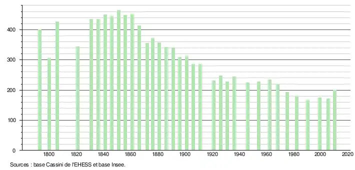 - Dans le tableau des recensements et le graphique, par convention dans Wikipédia, le principe a été retenu, pour les populations légales postérieures à 1999 de n’afficher dans le tableau des recensements et le graphique que les populations correspondant à l'année 2006, première population légale publiée calculée conformément aux concepts définis dans le décret no 2003-485 du 5 juin 2003, et les années correspondant à une enquête exhaustive de recensement pour les communes de moins de 10 000 habitants, ainsi que la dernière population légale publiée par l’Insee.