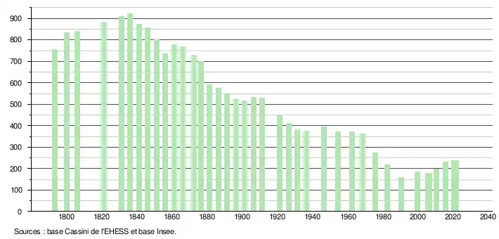 L'évolution du nombre d'habitants est connue à travers les recensements de la population effectués dans la commune depuis 1793. Pour les communes de moins de 10 000 habitants, une enquête de recensement portant sur toute la population est réalisée tous les cinq ans, les populations légales des années intermédiaires étant quant à elles estimées par interpolation ou extrapolation[24]. Pour la commune, le premier recensement exhaustif entrant dans le cadre du nouveau dispositif a été réalisé en 2005[25].
