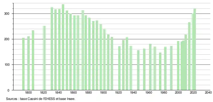 L'évolution du nombre d'habitants est connue à travers les recensements de la population effectués dans la commune depuis 1793. Pour les communes de moins de 10 000 habitants, une enquête de recensement portant sur toute la population est réalisée tous les cinq ans, les populations légales des années intermédiaires étant quant à elles estimées par interpolation ou extrapolation[17]. Pour la commune, le premier recensement exhaustif entrant dans le cadre du nouveau dispositif a été réalisé en 2004[18].