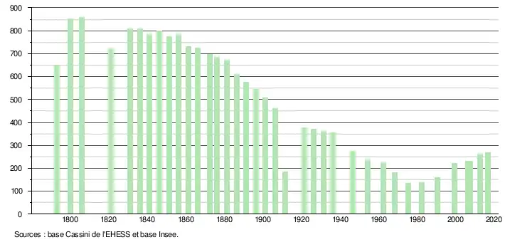 L'évolution du nombre d'habitants est connue à travers les recensements de la population effectués dans la commune depuis 1793. Pour les communes de moins de 10 000 habitants, une enquête de recensement portant sur toute la population est réalisée tous les cinq ans, les populations légales des années intermédiaires étant quant à elles estimées par interpolation ou extrapolation[6]. Pour la commune, le premier recensement exhaustif entrant dans le cadre du nouveau dispositif a été réalisé en 2007[7].