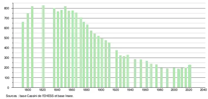 L'évolution du nombre d'habitants est connue à travers les recensements de la population effectués dans la commune depuis 1793. Pour les communes de moins de 10 000 habitants, une enquête de recensement portant sur toute la population est réalisée tous les cinq ans, les populations légales des années intermédiaires étant quant à elles estimées par interpolation ou extrapolation[23]. Pour la commune, le premier recensement exhaustif entrant dans le cadre du nouveau dispositif a été réalisé en 2005[24].