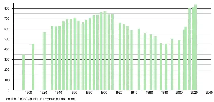 L'évolution du nombre d'habitants est connue à travers les recensements de la population effectués dans la commune depuis 1793. Pour les communes de moins de 10 000 habitants, une enquête de recensement portant sur toute la population est réalisée tous les cinq ans, les populations légales des années intermédiaires étant quant à elles estimées par interpolation ou extrapolation[16]. Pour la commune, le premier recensement exhaustif entrant dans le cadre du nouveau dispositif a été réalisé en 2008[17].