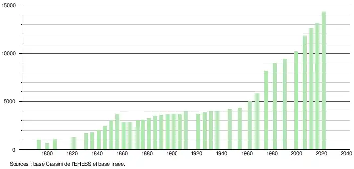 L'évolution du nombre d'habitants est connue à travers les recensements de la population effectués dans la commune depuis 1793. Pour les communes de plus de 10 000 habitants les recensements ont lieu chaque année à la suite d'une enquête par sondage auprès d'un échantillon d'adresses représentant 8 % de leurs logements, contrairement aux autres communes qui ont un recensement réel tous les cinq ans[38],[Note 3].