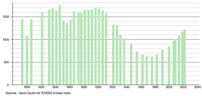 L'évolution du nombre d'habitants est connue à travers les recensements de la population effectués dans la commune depuis 1793. Pour les communes de moins de 10 000 habitants, une enquête de recensement portant sur toute la population est réalisée tous les cinq ans, les populations légales des années intermédiaires étant quant à elles estimées par interpolation ou extrapolation[24]. Pour la commune, le premier recensement exhaustif entrant dans le cadre du nouveau dispositif a été réalisé en 2008[25].
