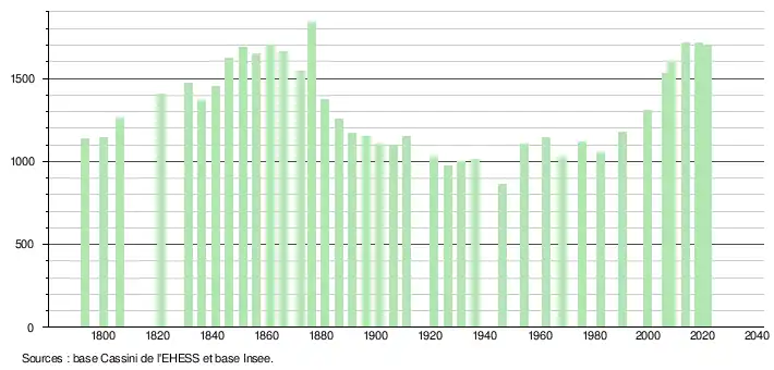 L'évolution du nombre d'habitants est connue à travers les recensements de la population effectués dans la commune depuis 1793. Pour les communes de moins de 10 000 habitants, une enquête de recensement portant sur toute la population est réalisée tous les cinq ans, les populations légales des années intermédiaires étant quant à elles estimées par interpolation ou extrapolation[14]. Pour la commune, le premier recensement exhaustif entrant dans le cadre du nouveau dispositif a été réalisé en 2008[15].
