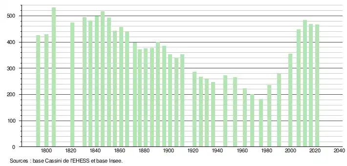 L'évolution du nombre d'habitants est connue à travers les recensements de la population effectués dans la commune depuis 1793. Pour les communes de moins de 10 000 habitants, une enquête de recensement portant sur toute la population est réalisée tous les cinq ans, les populations légales des années intermédiaires étant quant à elles estimées par interpolation ou extrapolation[19]. Pour la commune, le premier recensement exhaustif entrant dans le cadre du nouveau dispositif a été réalisé en 2006[20].