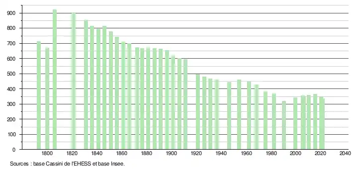 L'évolution du nombre d'habitants est connue à travers les recensements de la population effectués dans la commune depuis 1793. Pour les communes de moins de 10 000 habitants, une enquête de recensement portant sur toute la population est réalisée tous les cinq ans, les populations légales des années intermédiaires étant quant à elles estimées par interpolation ou extrapolation[18]. Pour la commune, le premier recensement exhaustif entrant dans le cadre du nouveau dispositif a été réalisé en 2005[19].
