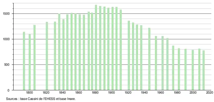 L'évolution du nombre d'habitants est connue à travers les recensements de la population effectués dans la commune depuis 1793. À partir du , les populations légales des communes sont publiées annuellement dans le cadre d'un recensement qui repose désormais sur une collecte d'information annuelle, concernant successivement tous les territoires communaux au cours d'une période de cinq ans. Pour les communes de moins de 10 000 habitants, une enquête de recensement portant sur toute la population est réalisée tous les cinq ans, les populations légales des années intermédiaires étant quant à elles estimées par interpolation ou extrapolation[8]. Pour la commune, le premier recensement exhaustif entrant dans le cadre du nouveau dispositif a été réalisé en 2007[9],[Note 1].