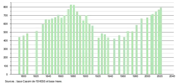 L'évolution du nombre d'habitants est connue à travers les recensements de la population effectués dans la commune depuis 1793. Pour les communes de moins de 10 000 habitants, une enquête de recensement portant sur toute la population est réalisée tous les cinq ans, les populations légales des années intermédiaires étant quant à elles estimées par interpolation ou extrapolation[17]. Pour la commune, le premier recensement exhaustif entrant dans le cadre du nouveau dispositif a été réalisé en 2008[18].