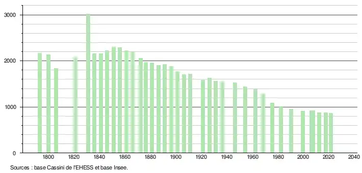 L'évolution du nombre d'habitants est connue à travers les recensements de la population effectués dans la commune depuis 1793. Pour les communes de moins de 10 000 habitants, une enquête de recensement portant sur toute la population est réalisée tous les cinq ans, les populations légales des années intermédiaires étant quant à elles estimées par interpolation ou extrapolation[29]. Pour la commune, le premier recensement exhaustif entrant dans le cadre du nouveau dispositif a été réalisé en 2007[30].