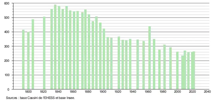 L'évolution du nombre d'habitants est connue à travers les recensements de la population effectués dans la commune depuis 1793. Pour les communes de moins de 10 000 habitants, une enquête de recensement portant sur toute la population est réalisée tous les cinq ans, les populations légales des années intermédiaires étant quant à elles estimées par interpolation ou extrapolation[18]. Pour la commune, le premier recensement exhaustif entrant dans le cadre du nouveau dispositif a été réalisé en 2004[19].
