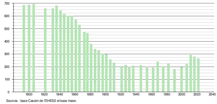 L'évolution du nombre d'habitants est connue à travers les recensements de la population effectués dans la commune depuis 1793. Pour les communes de moins de 10 000 habitants, une enquête de recensement portant sur toute la population est réalisée tous les cinq ans, les populations légales des années intermédiaires étant quant à elles estimées par interpolation ou extrapolation[23]. Pour la commune, le premier recensement exhaustif entrant dans le cadre du nouveau dispositif a été réalisé en 2006[24].