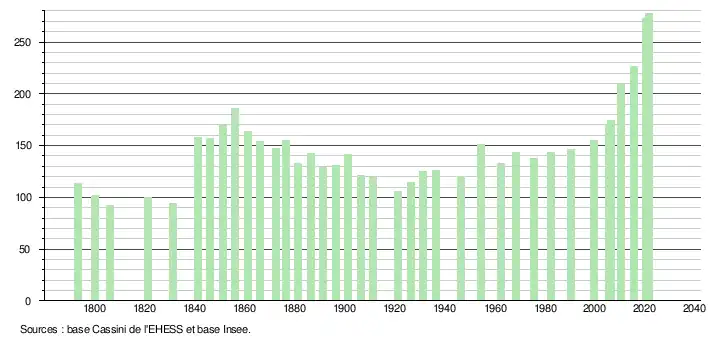 L'évolution du nombre d'habitants est connue à travers les recensements de la population effectués dans la commune depuis 1793. Pour les communes de moins de 10 000 habitants, une enquête de recensement portant sur toute la population est réalisée tous les cinq ans, les populations légales des années intermédiaires étant quant à elles estimées par interpolation ou extrapolation[18]. Pour la commune, le premier recensement exhaustif entrant dans le cadre du nouveau dispositif a été réalisé en 2005[19].
