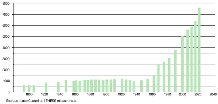 L'évolution du nombre d'habitants est connue à travers les recensements de la population effectués dans la commune depuis 1793. Pour les communes de moins de 10 000 habitants, une enquête de recensement portant sur toute la population est réalisée tous les cinq ans, les populations légales des années intermédiaires étant quant à elles estimées par interpolation ou extrapolation[39]. Pour la commune, le premier recensement exhaustif entrant dans le cadre du nouveau dispositif a été réalisé en 2006[40].