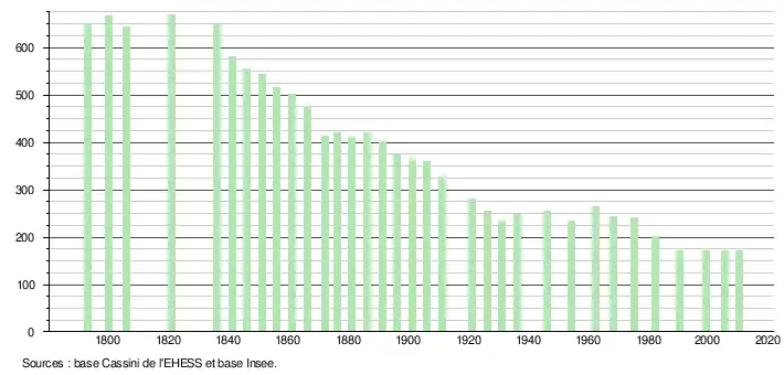 L'évolution du nombre d'habitants est connue à travers les recensements de la population effectués dans la commune depuis 1793. À partir du , les populations légales des communes sont publiées annuellement dans le cadre d'un recensement qui repose désormais sur une collecte d'information annuelle, concernant successivement tous les territoires communaux au cours d'une période de cinq ans. Pour les communes de moins de 10 000 habitants, une enquête de recensement portant sur toute la population est réalisée tous les cinq ans, les populations légales des années intermédiaires étant quant à elles estimées par interpolation ou extrapolation[7]. Pour la commune, le premier recensement exhaustif entrant dans le cadre du nouveau dispositif a été réalisé en 2005[8],[Note 2].