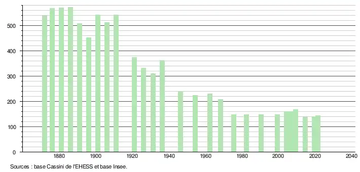 L'évolution du nombre d'habitants est connue à travers les recensements de la population effectués dans la commune depuis 1872. Pour les communes de moins de 10 000 habitants, une enquête de recensement portant sur toute la population est réalisée tous les cinq ans, les populations légales des années intermédiaires étant quant à elles estimées par interpolation ou extrapolation[27]. Pour la commune, le premier recensement exhaustif entrant dans le cadre du nouveau dispositif a été réalisé en 2004[28].