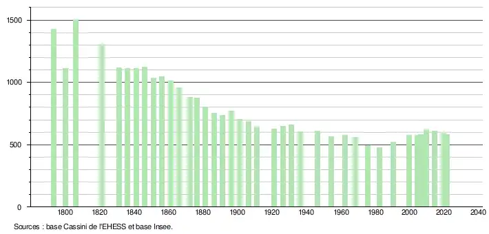 L'évolution du nombre d'habitants est connue à travers les recensements de la population effectués dans la commune depuis 1793. Pour les communes de moins de 10 000 habitants, une enquête de recensement portant sur toute la population est réalisée tous les cinq ans, les populations légales des années intermédiaires étant quant à elles estimées par interpolation ou extrapolation[22]. Pour la commune, le premier recensement exhaustif entrant dans le cadre du nouveau dispositif a été réalisé en 2004[23].