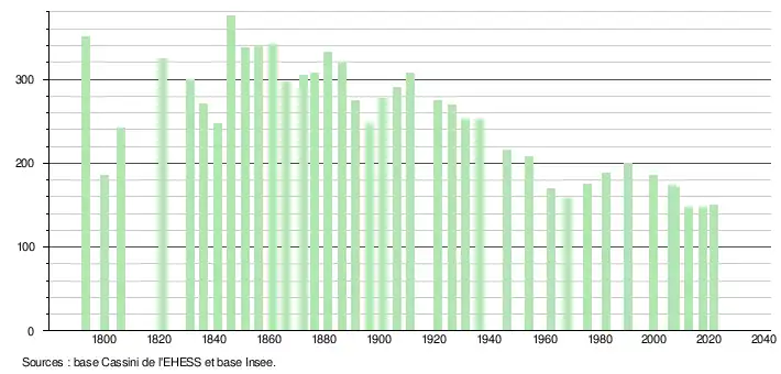 L'évolution du nombre d'habitants est connue à travers les recensements de la population effectués dans la commune depuis 1793. Pour les communes de moins de 10 000 habitants, une enquête de recensement portant sur toute la population est réalisée tous les cinq ans, les populations légales des années intermédiaires étant quant à elles estimées par interpolation ou extrapolation[26]. Pour la commune, le premier recensement exhaustif entrant dans le cadre du nouveau dispositif a été réalisé en 2007[27].