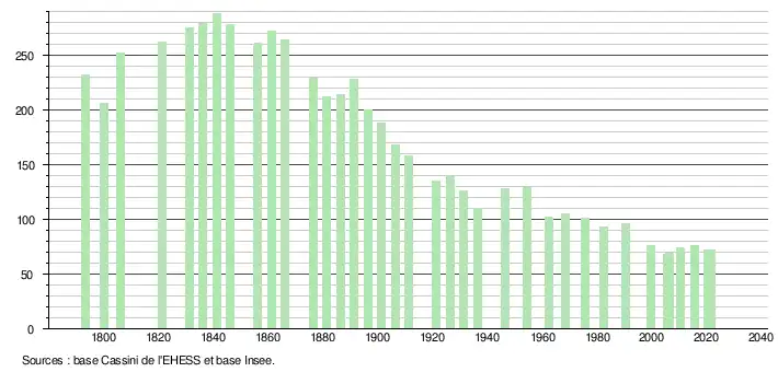 L'évolution du nombre d'habitants est connue à travers les recensements de la population effectués dans la commune depuis 1793. Pour les communes de moins de 10 000 habitants, une enquête de recensement portant sur toute la population est réalisée tous les cinq ans, les populations légales des années intermédiaires étant quant à elles estimées par interpolation ou extrapolation[18]. Pour la commune, le premier recensement exhaustif entrant dans le cadre du nouveau dispositif a été réalisé en 2005[19].