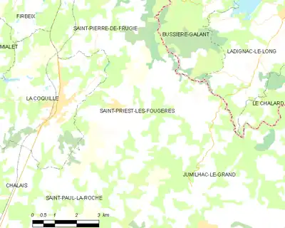 Saint-Priest-les-Fougères est limitrophe de cinq autres communes dont une dans le département de la Haute-Vienne. Au nord-est, son territoire est distant d'une soixantaine de mètres de celui de Ladignac-le-Long, en Haute-Vienne.