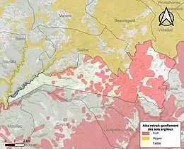 Le retrait-gonflement des sols argileux est susceptible d'engendrer des dommages importants aux bâtiments en cas d’alternance de périodes de sécheresse et de pluie. 55,4 % de la superficie communale est en aléa moyen ou fort (92 % au niveau départemental et 48,5 % au niveau national). Sur les 294 bâtiments dénombrés sur la commune en 2019, 135 sont en aléa moyen ou fort, soit 46 %, à comparer aux 96 % au niveau départemental et 54 % au niveau national. Une cartographie de l'exposition du territoire national au retrait gonflement des sols argileux est disponible sur le site du BRGM[33],[Carte 3].