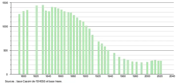 L'évolution du nombre d'habitants est connue à travers les recensements de la population effectués dans la commune depuis 1793. Pour les communes de moins de 10 000 habitants, une enquête de recensement portant sur toute la population est réalisée tous les cinq ans, les populations légales des années intermédiaires étant quant à elles estimées par interpolation ou extrapolation[41]. Pour la commune, le premier recensement exhaustif entrant dans le cadre du nouveau dispositif a été réalisé en 2007[42].