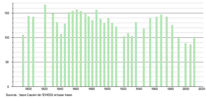 L'évolution du nombre d'habitants est connue à travers les recensements de la population effectués dans la commune depuis 1793. À partir du , les populations légales des communes sont publiées annuellement dans le cadre d'un recensement qui repose désormais sur une collecte d'information annuelle, concernant successivement tous les territoires communaux au cours d'une période de cinq ans. Pour les communes de moins de 10 000 habitants, une enquête de recensement portant sur toute la population est réalisée tous les cinq ans, les populations légales des années intermédiaires étant quant à elles estimées par interpolation ou extrapolation[8]. Pour la commune, le premier recensement exhaustif entrant dans le cadre du nouveau dispositif a été réalisé en 2005[9],[Note 1].
