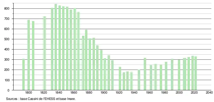 | L'évolution du nombre d'habitants est connue à travers les recensements de la population effectués dans la commune depuis 1793. Pour les communes de moins de 10 000 habitants, une enquête de recensement portant sur toute la population est réalisée tous les cinq ans, les populations légales des années intermédiaires étant quant à elles estimées par interpolation ou extrapolation[41]. Pour la commune, le premier recensement exhaustif entrant dans le cadre du nouveau dispositif a été réalisé en 2007[42]. En 2021, la commune comptait 329 habitants[Note 6], en diminution de 0,9 % par rapport à 2015 (Ariège : +1,38 %, France hors Mayotte : +1,84 %). |