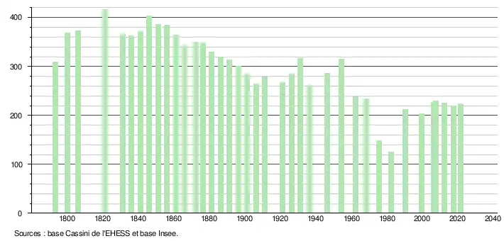 L'évolution du nombre d'habitants est connue à travers les recensements de la population effectués dans la commune depuis 1793. Pour les communes de moins de 10 000 habitants, une enquête de recensement portant sur toute la population est réalisée tous les cinq ans, les populations légales des années intermédiaires étant quant à elles estimées par interpolation ou extrapolation[23]. Pour la commune, le premier recensement exhaustif entrant dans le cadre du nouveau dispositif a été réalisé en 2007[24].
