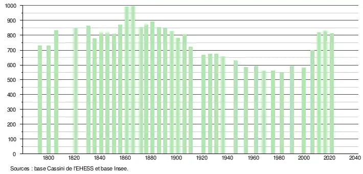 L'évolution du nombre d'habitants est connue à travers les recensements de la population effectués dans la commune depuis 1793. Pour les communes de moins de 10 000 habitants, une enquête de recensement portant sur toute la population est réalisée tous les cinq ans, les populations légales des années intermédiaires étant quant à elles estimées par interpolation ou extrapolation[16]. Pour la commune, le premier recensement exhaustif entrant dans le cadre du nouveau dispositif a été réalisé en 2006[17].