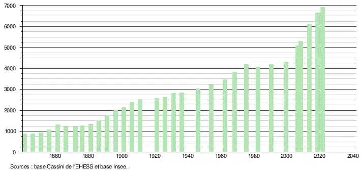 L'évolution du nombre d'habitants est connue à travers les recensements de la population effectués dans la commune depuis 1841. Pour les communes de moins de 10 000 habitants, une enquête de recensement portant sur toute la population est réalisée tous les cinq ans, les populations légales des années intermédiaires étant quant à elles estimées par interpolation ou extrapolation[25]. Pour la commune, le premier recensement exhaustif entrant dans le cadre du nouveau dispositif a été réalisé en 2008[26].