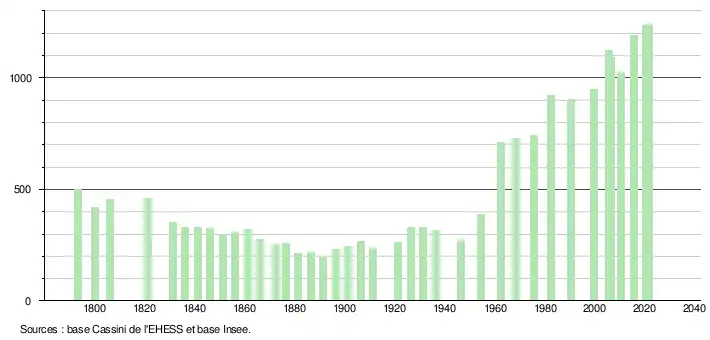 L'évolution du nombre d'habitants est connue à travers les recensements de la population effectués dans la commune depuis 1793. Pour les communes de moins de 10 000 habitants, une enquête de recensement portant sur toute la population est réalisée tous les cinq ans, les populations légales des années intermédiaires étant quant à elles estimées par interpolation ou extrapolation[23]. Pour la commune, le premier recensement exhaustif entrant dans le cadre du nouveau dispositif a été réalisé en 2005[24].