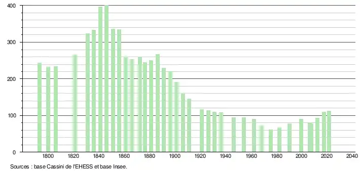 L'évolution du nombre d'habitants est connue à travers les recensements de la population effectués dans la commune depuis 1793. Pour les communes de moins de 10 000 habitants, une enquête de recensement portant sur toute la population est réalisée tous les cinq ans, les populations légales des années intermédiaires étant quant à elles estimées par interpolation ou extrapolation[44]. Pour la commune, le premier recensement exhaustif entrant dans le cadre du nouveau dispositif a été réalisé en 2007[45].
