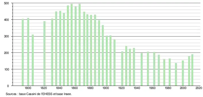L'évolution du nombre d'habitants est connue à travers les recensements de la population effectués dans la commune depuis 1793. À partir du , les populations légales des communes sont publiées annuellement dans le cadre d'un recensement qui repose désormais sur une collecte d'information annuelle, concernant successivement tous les territoires communaux au cours d'une période de cinq ans. Pour les communes de moins de 10 000 habitants, une enquête de recensement portant sur toute la population est réalisée tous les cinq ans, les populations légales des années intermédiaires étant quant à elles estimées par interpolation ou extrapolation[3]. Pour la commune, le premier recensement exhaustif entrant dans le cadre du nouveau dispositif a été réalisé en 2007[4],[Note 1].