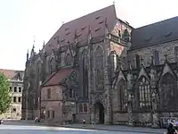 À l'extérieur se trouvent également plusieurs œuvres importantes, comme une épitaphe créée par Adam Kraft en 1492, appelée la Schreyer-Landauer Epitaph, d'après les commanditaires Sebald Schreyer et Matthäus Landauer, deux représentants des familles Schreyer et Landauer. Trois hauts-reliefs en grès décrivent à gauche le Christ portant la croix, au milieu d'une foule de badauds, au centre la mise au tombeau, avec les trois femmes, l'apôtre Jean, Nicodème et Joseph d'Arimathie et à droite la Résurrection du Christ. Sur le bord droit il y a deux personnages portant des instruments de torture qui, dans la tradition chrétienne du Moyen Âge, représentaient les armes avec lesquels le Christ a vaincu la mort. Ce deux personnages sont parfois assimilés à Sebald Schreyer et Adam Kraft, sans qu'il y ait de preuve précise[1].