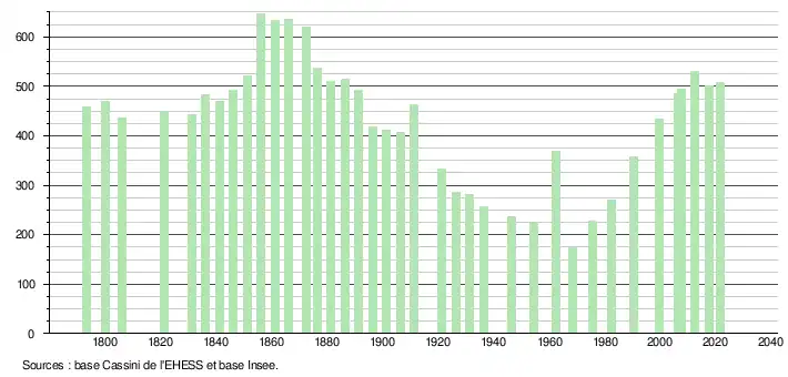 L'évolution du nombre d'habitants est connue à travers les recensements de la population effectués dans la commune depuis 1793. Pour les communes de moins de 10 000 habitants, une enquête de recensement portant sur toute la population est réalisée tous les cinq ans, les populations légales des années intermédiaires étant quant à elles estimées par interpolation ou extrapolation[26]. Pour la commune, le premier recensement exhaustif entrant dans le cadre du nouveau dispositif a été réalisé en 2007[27].